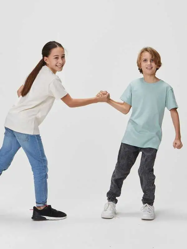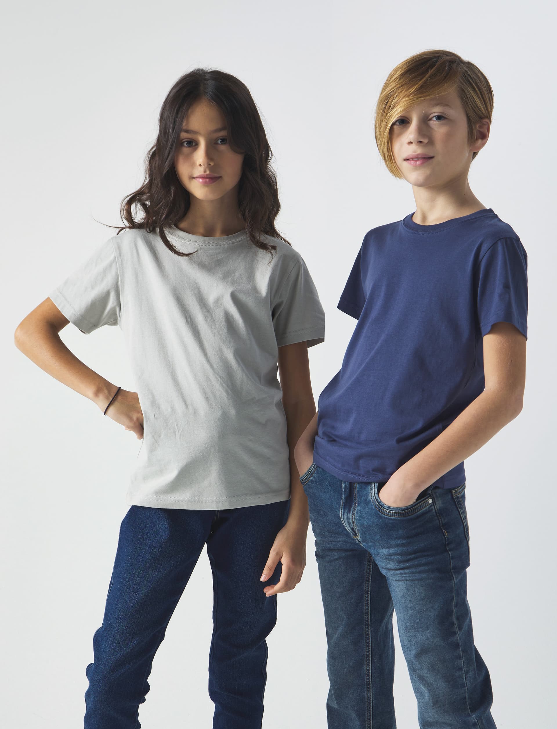 100% cotone . T-shirt manica corta, tessuto ring-spun single jersey, girocollo in costina con cucitura a doppio ago, nastro di rinforzo alle spalle, struttura con cuciture laterali, leggermente sfiancata. Etichetta strappabile. Composizione: Grey Heather: 85% cot. 15% visc.